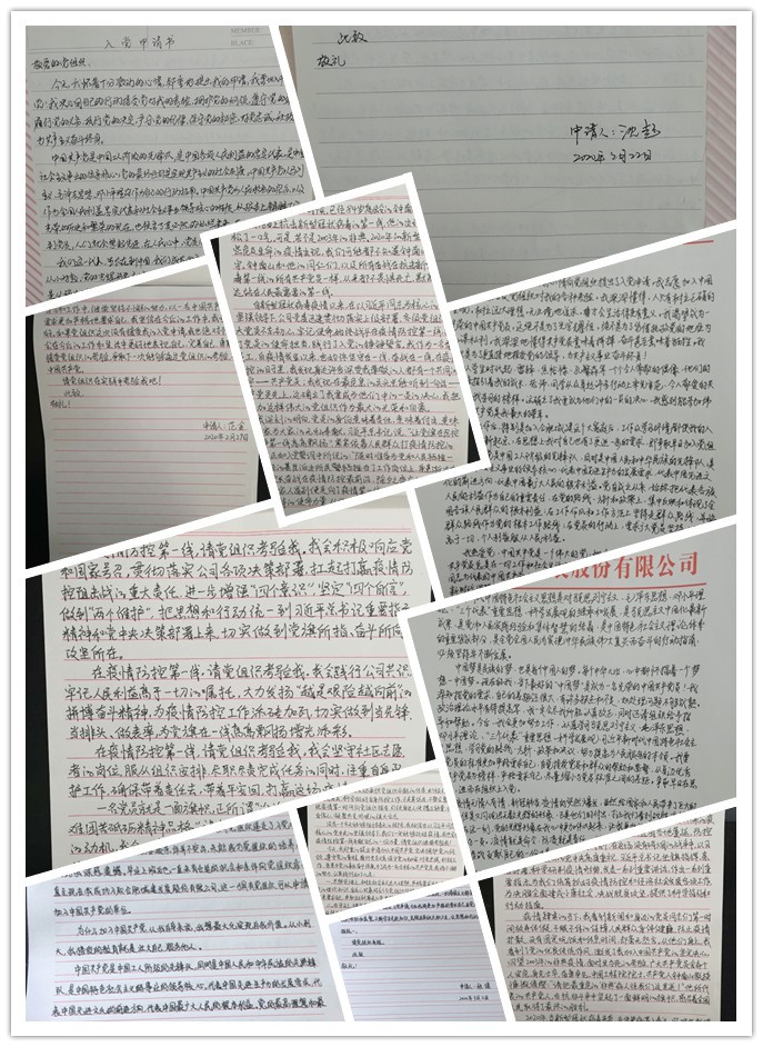 下沉支援工作期间,蜀山分公司范宏涛驻点在林溪社区御湖上园门岗,他主动认领了严寒的晚班值守,看到社区工作人员每天给隔离户送蔬菜等生活用品,他贴心地给工作人员送来了防护服;气温骤降,风雪交加,他又及时调来免费的集装箱,筑牢社区疫情防控战壕,在采访报道中被亲切地称为防疫一线的“暖宝宝”。“自下沉以来,社区党员们一个个无私奉献的身影,让我们看到了党旗在防控疫情斗争第一线高高飘扬,我一定不负重托,不辱使命,争取早日成为和他们一样的人。”3月2日范洪涛递交入党申请时激动的说。琥珀物业王智志、张岩从春节前就放弃休息,坚守岗位,在接到下沉支援号召后,第一时间主动请缨转战支援。营销企划部90后员工黄鹤铖“身兼双职”,12小时的值守后继续参与防疫抗疫宣传工作。吴耀耀恪尽职守,助力社区防控疫情,在社区发来的致谢信中被亲切地称为“战友”。范金、张健、仇照尽管已经在社区一线值守近一个月,但仍主动要求继续坚守,拒绝换班。他们说:“虽然我们不是医护人员,不能冲到一线救死扶伤,但是我们愿意在这场没有硝烟的战场上,接受党组织对我的任何考验,能在这个时候加入党组织我们将感到无比光荣!”朴实的语言表达了对入党的无限渴望。尽管他们年龄不同、岗位不同、角色不同,但此时此刻的信仰是一致的,是坚定的!在这场特殊地战争中,选择入党就意味着选择责任,选择奉献。